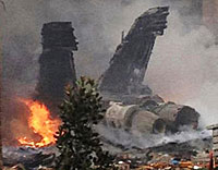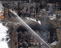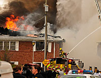 The 15-ton fighter jet crashes through the roof and upper floor of 1003 Fleming Circle. Both 1003 and 1005 Fleming Circle, once connected end-to-end, burst into flames, incur heavy damage and partially collapse.