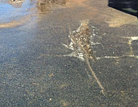 The aircraft strikes the parking lot west of the apartment building at 1003 Fleming Circle. It leaves a large impact mark, shown below, on the ground about 20 feet from the building.